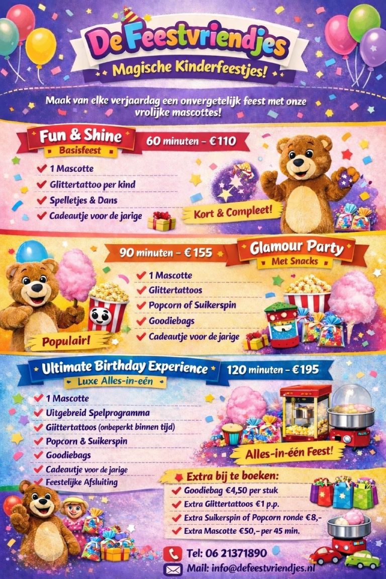 Bekijk onze uitgebreide prijslijst voor kinderfeestjes en ontdek welke diensten we aanbieden. Van decoratie tot entertainment, alles is inbegrepen. Perfect voor een geslaagd feestje!